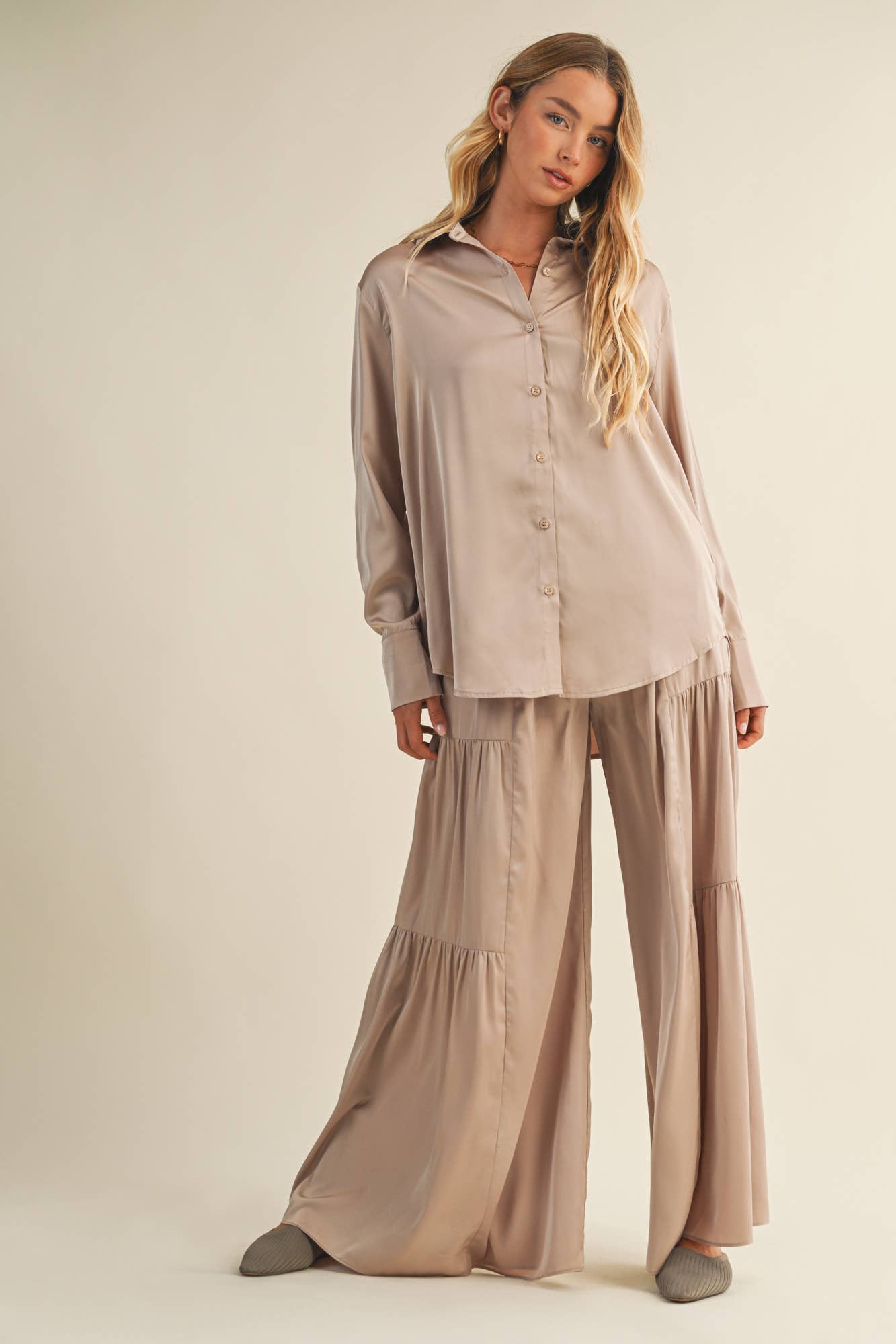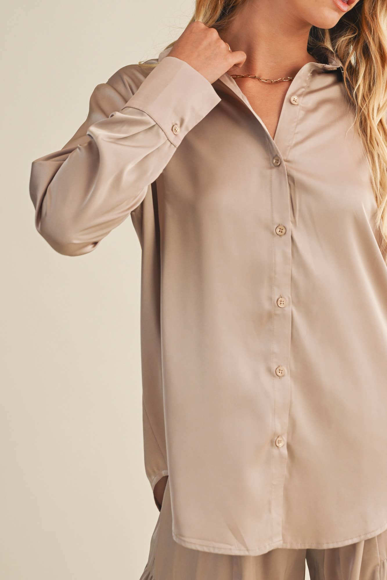Elevate your everyday look with this silky button down shirt. Crafted from lightweight, soft-to-the-touch fabric, it drapes beautifully for a polished yet effortless style. Featuring a classic collar, button front, and long sleeves with buttoned cuffs, this shirt transitions seamlessly from work to weekend. Pair it with trousers for the office or jeans for a chic casual vibe.